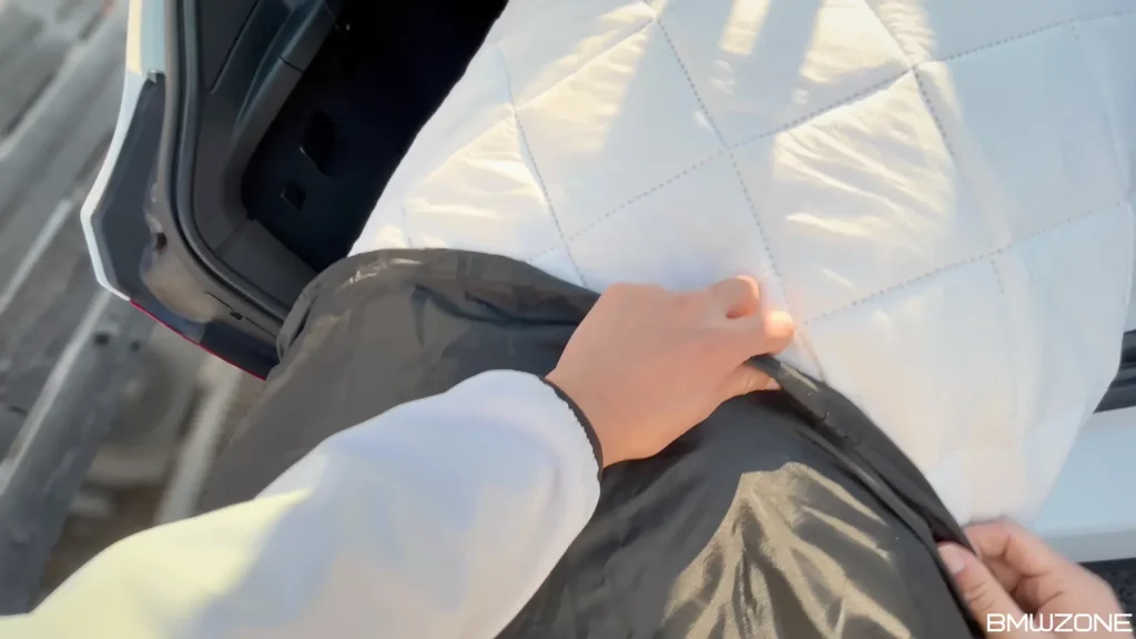 あとはジッパーがついている方を運転席側にして、そのまま両側面へスルスルと下ろしていけば、あっという間にカバー掛けが完了しますよ!