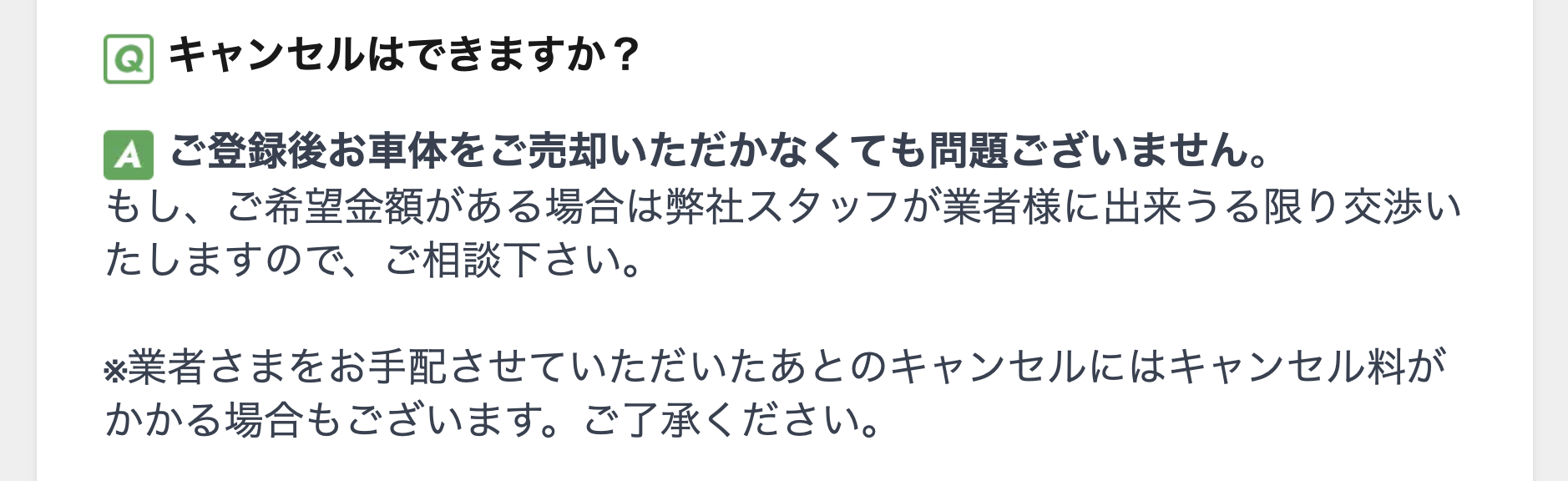 私が唯一デメリットとして感じた部分について感じたのは、キャンセル料が発生しない買取キャンセルのタイミングについてWebサイトのQ&Aを見ると少々分かりにくかったこと。