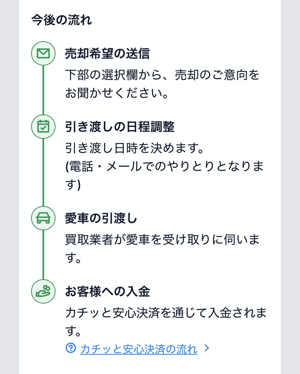 これは、「カチエックスが先に買取店から代金を預かり、その確認が取れてから車両を引き渡す」というシステムです。 お金の確保が確定してから車を渡すので、入金トラブルが未然に防がれています。これも安心材料の一つでした。
